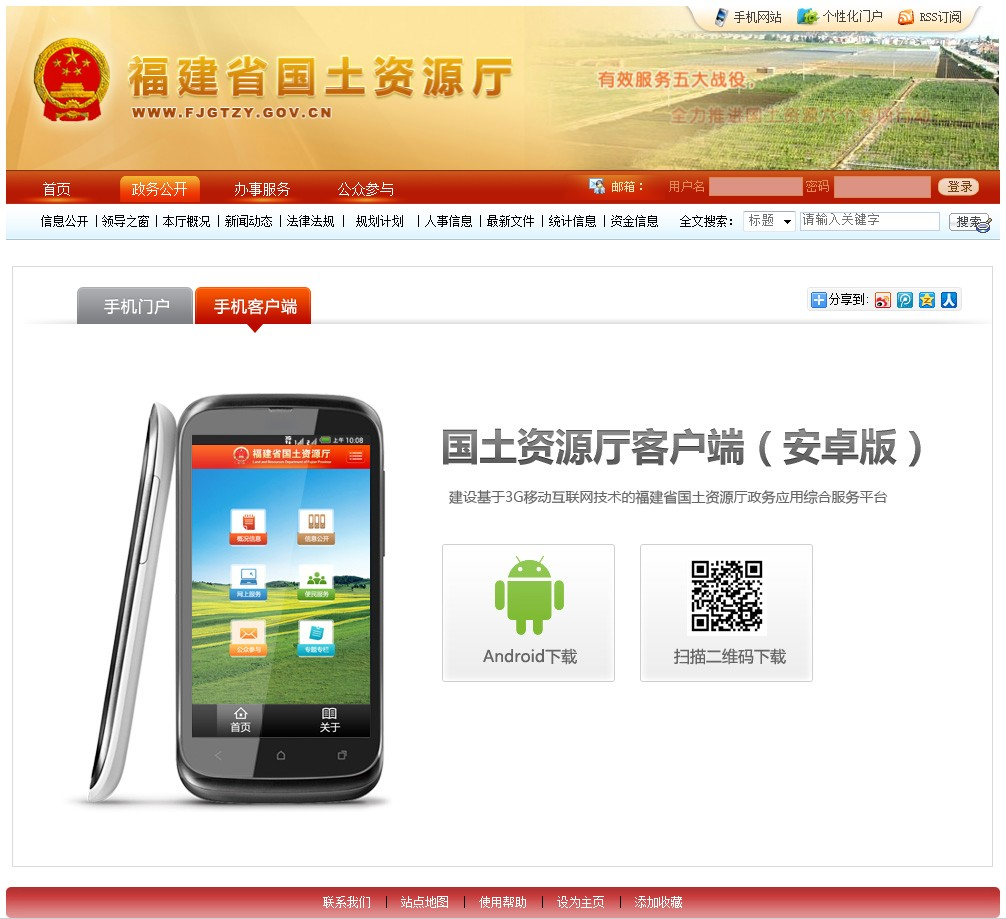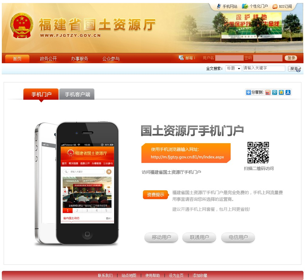 2012年11月26日,福建省國土資源廳(網(wǎng)址:http://www.fjgtzy.gov.cn)“新技術(shù)(手機(jī)門戶、個(gè)性化門戶)”建設(shè)完成并正式上線運(yùn)行。