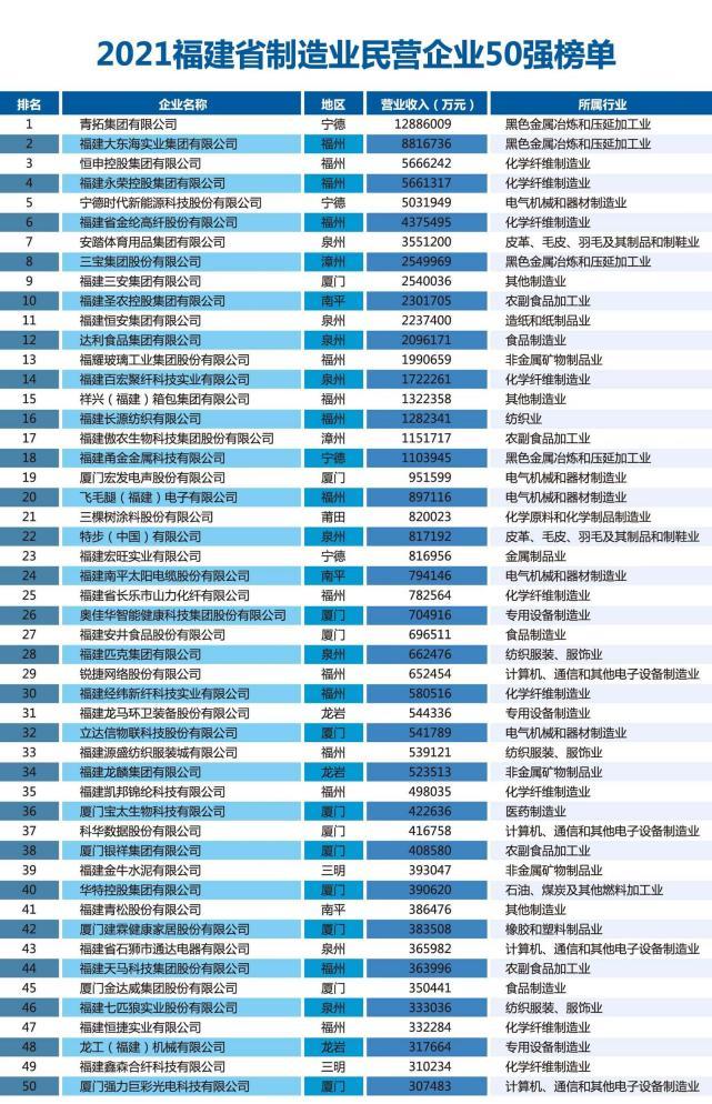10月15日,福建省工商聯(lián)在三明發(fā)布“2021福建省民營(yíng)企業(yè)100強(qiáng)”“2021福建省創(chuàng)新型民營(yíng)企業(yè)100強(qiáng)”“2021福建省民營(yíng)企業(yè)制造業(yè)50強(qiáng)”榜單,同時(shí)發(fā)布《2021福建省民營(yíng)企業(yè)100強(qiáng)分析報(bào)告》《2021福建省民營(yíng)企業(yè)社會(huì)責(zé)任報(bào)告》。報(bào)告顯示,福建省民營(yíng)經(jīng)濟(jì)高質(zhì)量發(fā)展成色明顯,成為經(jīng)濟(jì)社會(huì)發(fā)展的重要力量和創(chuàng)造社會(huì)財(cái)富的重要來源。