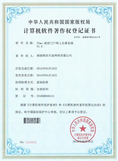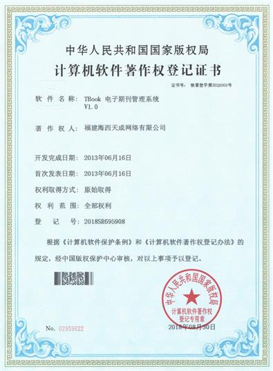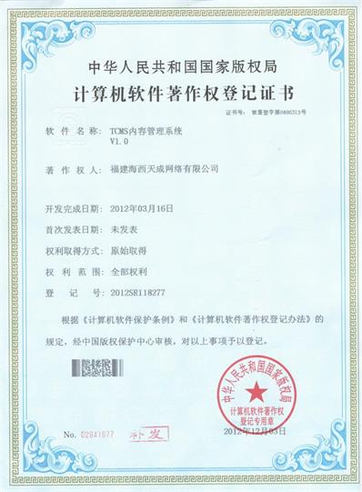 各項(xiàng)證書的取得有利于保護(hù)公司的知識產(chǎn)權(quán),提高品牌知名度,保持技術(shù)領(lǐng)先優(yōu)勢,從而提升公司的核心競爭力,對公司產(chǎn)品推廣和市場拓展產(chǎn)生積極的影響。通過天成人的不懈努力,業(yè)務(wù)發(fā)展蒸蒸日上,技術(shù)一直處于領(lǐng)先;這不僅是公司取得的成就,更重要是我們的技術(shù)在一步步向上發(fā)展,公司實(shí)力在不斷的進(jìn)步和增強(qiáng)。軟著證書是公司技術(shù)團(tuán)隊(duì)的心血,凝聚了先進(jìn)的技術(shù)力量,使海西天成走向更強(qiáng)、更遠(yuǎn)。